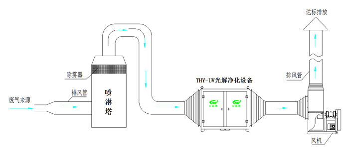 食品废气处理考虑运营成本及安全性,本方案工艺路线拟定采用“通风系统(风机、收集罩、管道)+预处理系统(水喷淋)+核心净化系统(UV光解净化设备)”来进行食品废气处理。工艺设备图如下: